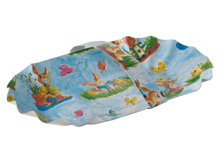 Diese ovalen Osterkörbchen aus stabiler Pappe mit einer Größe von 28 cm x 16 cm eignen sich ideal zum Sammeln und Präsentieren von Ostereiern sowie kleinen Osterüberraschungen. Die Körbchen sind mit liebevollen Ostermotiven wie bunten Ostereiern und niedlichen Osterhasen gestaltet und verfügen über einen praktischen Henkel, der das Tragen besonders einfach macht.